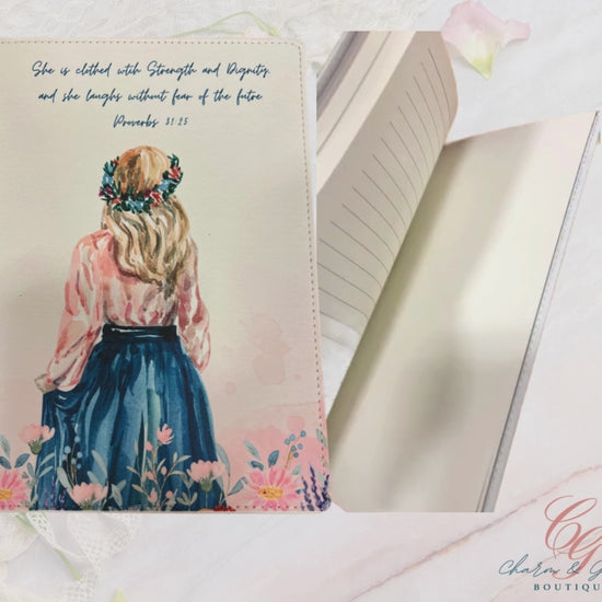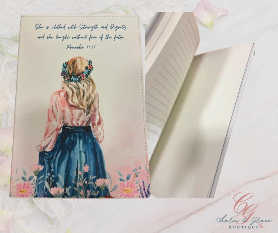 Stay inspired and organized with our Proverbs 31:25 Journal. Its faux leather cover and 190 lined blank pages make it perfect for writing your thoughts, dreams, and plans. With a colorful cover and a compact size of 8.3 x 6", this journal is the perfect companion for those seeking daily motivation.